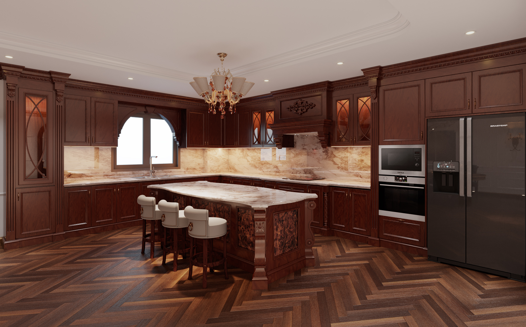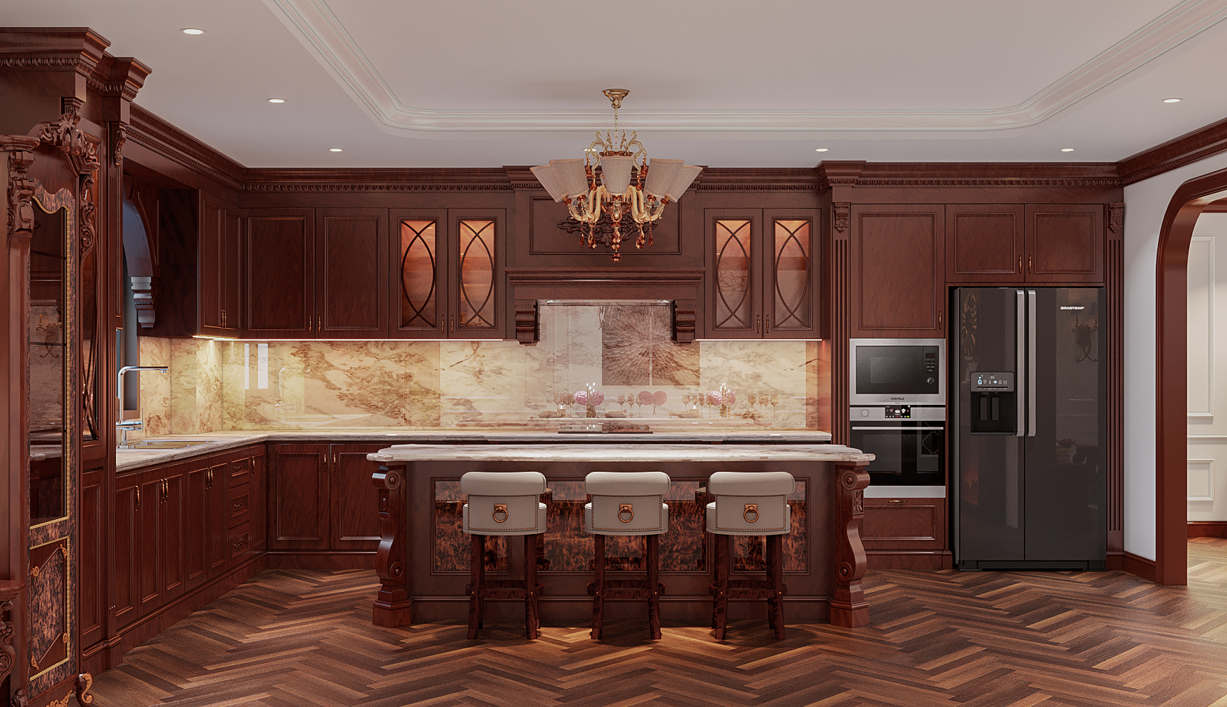 Khu vực bếp nổi bật với hệ tủ gỗ tự nhiên kết hợp mặt đá Marble vân tinh xảo. Đảo bếp lớn vừa là nơi chuẩn bị đồ ăn, vừa là bàn ăn nhanh cho gia đình.