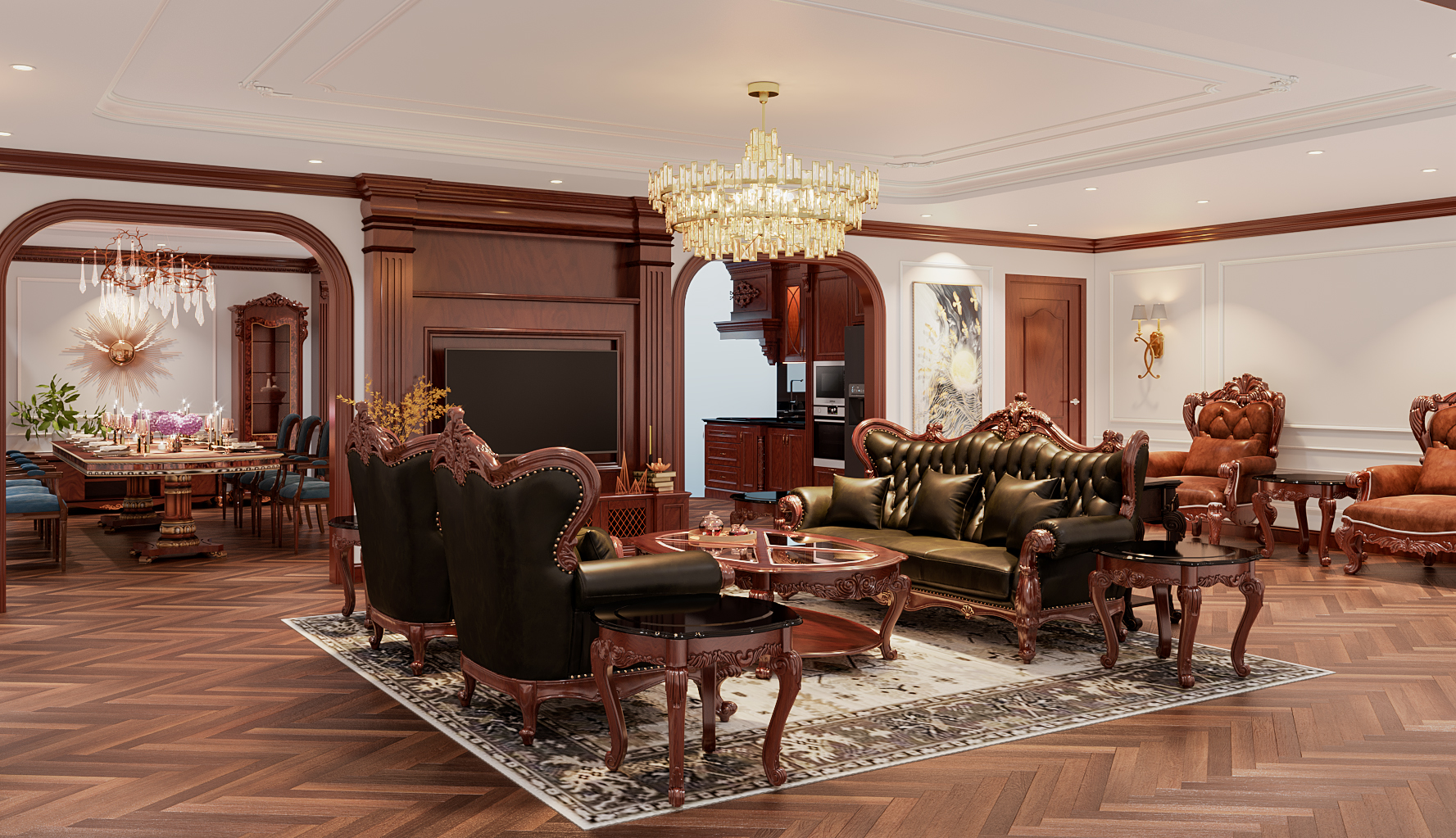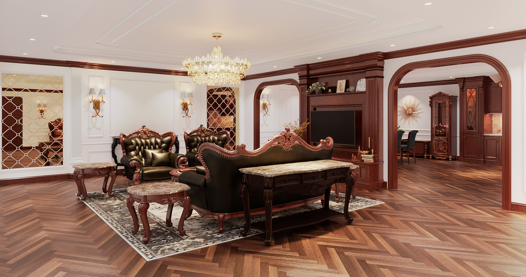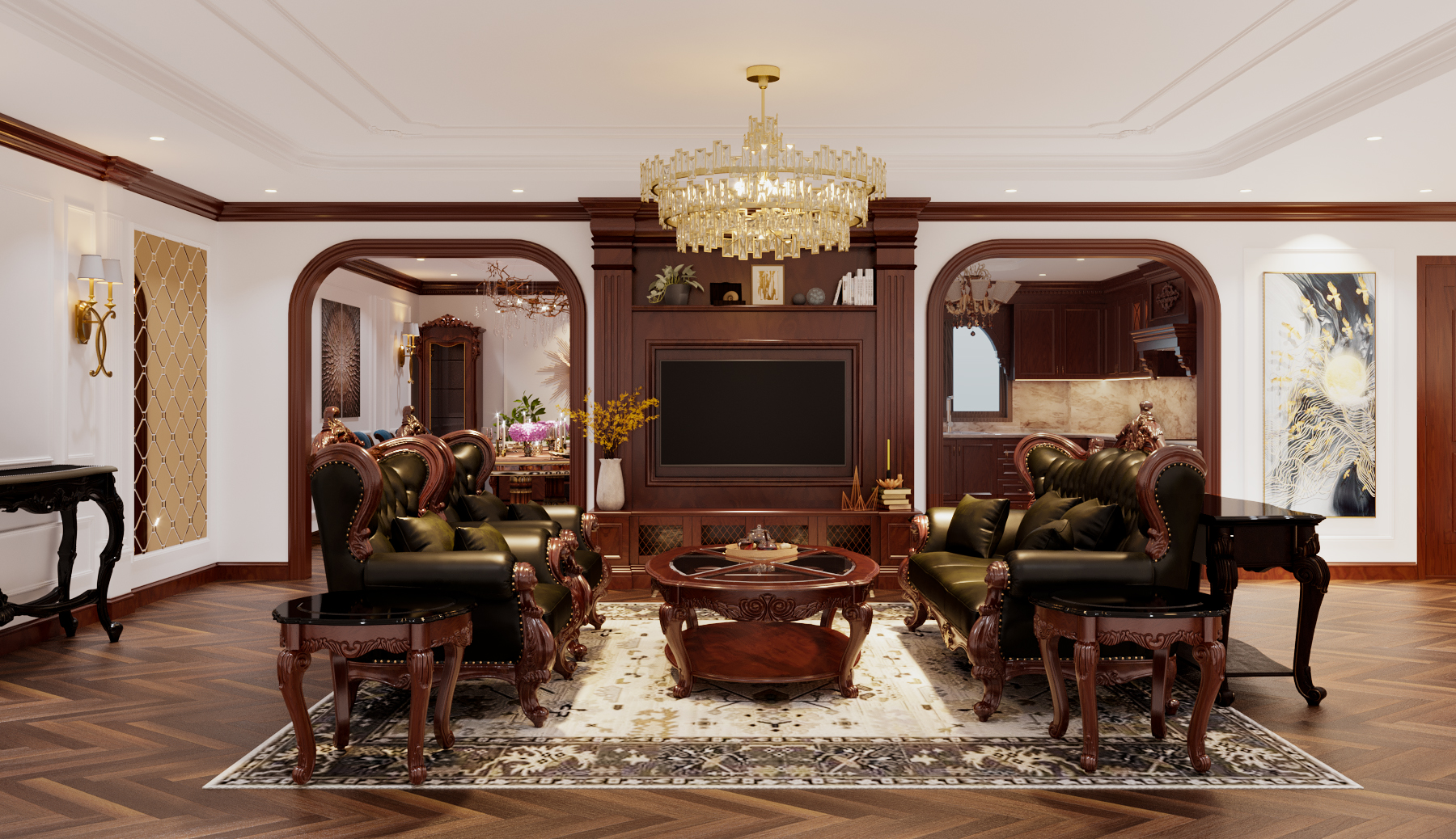 Tông màu gỗ trầm kết hợp ánh sáng vàng từ đèn chùm pha lê mang lại cảm giác ấm áp – bề thế – đẳng cấp cho không gian tiếp khách của gia đình.