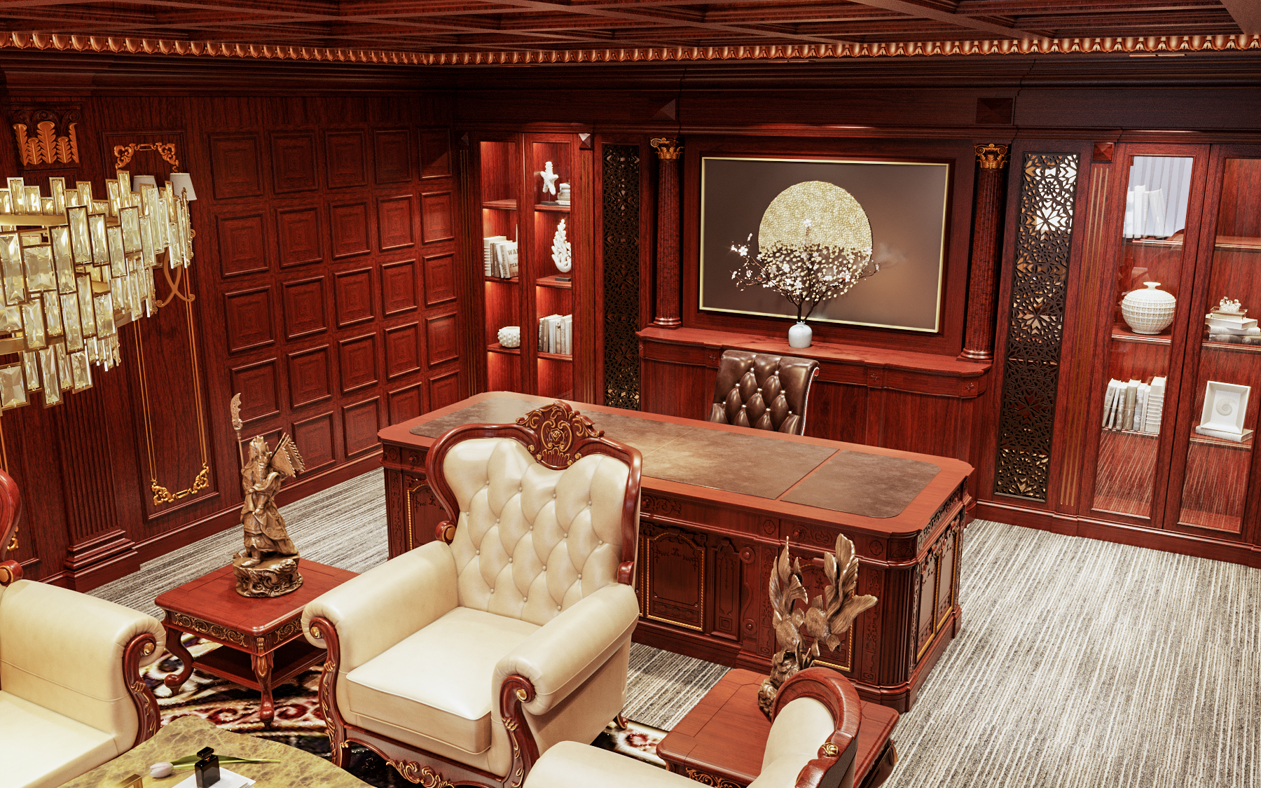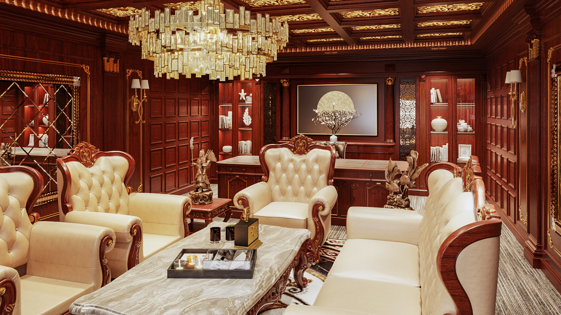 - Bàn làm việc lớn với chi tiết chạm trổ