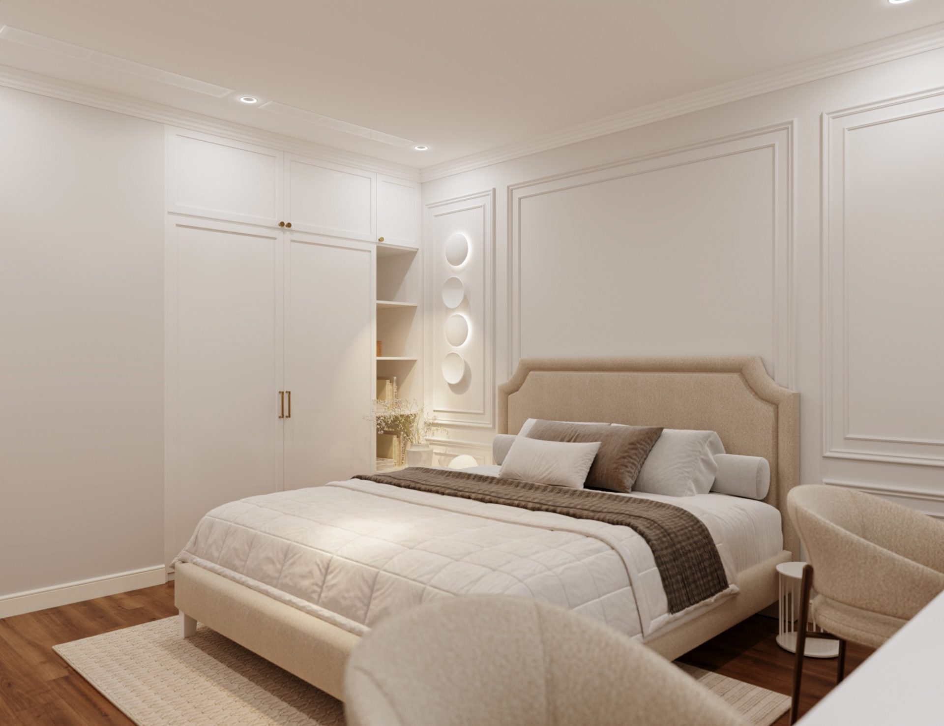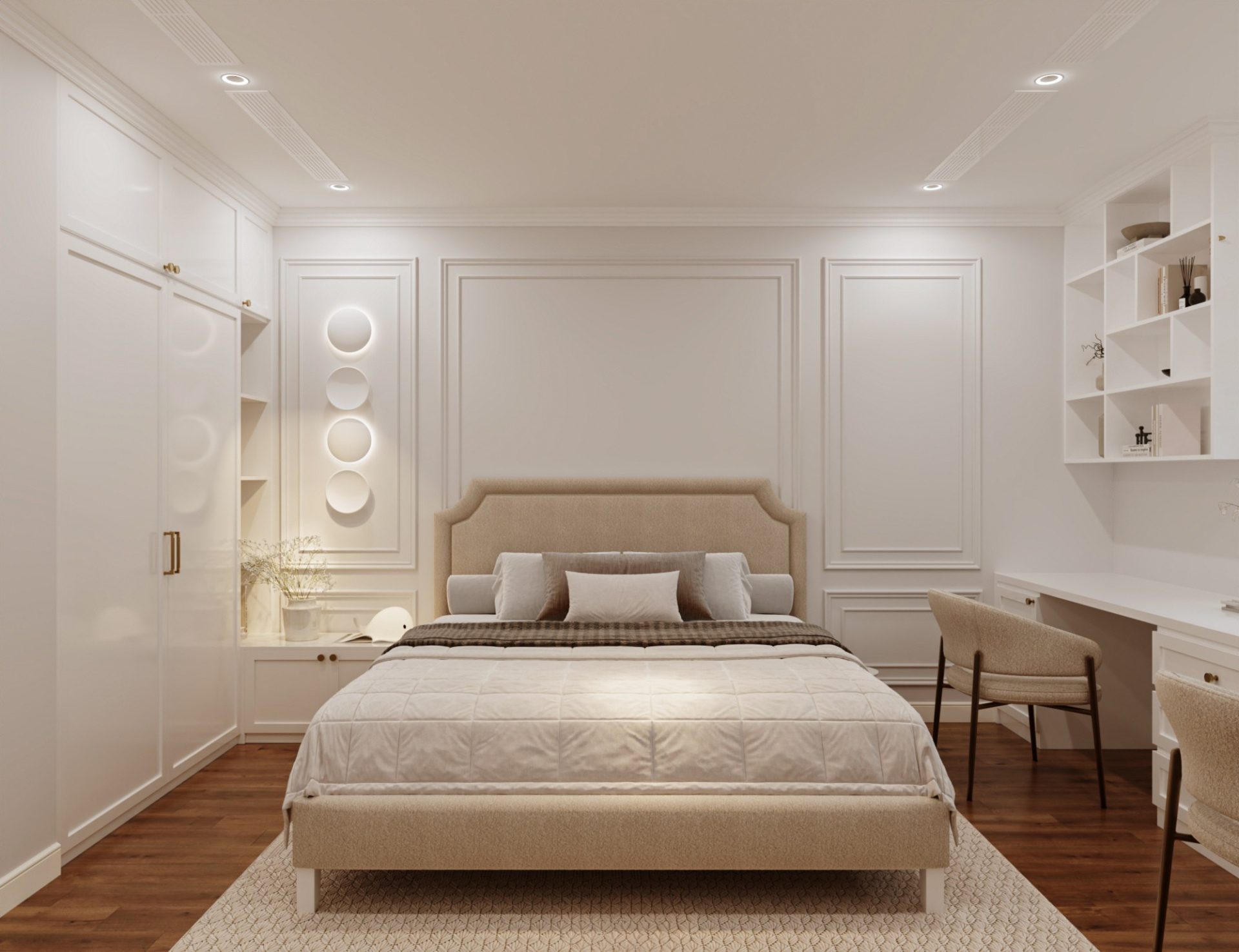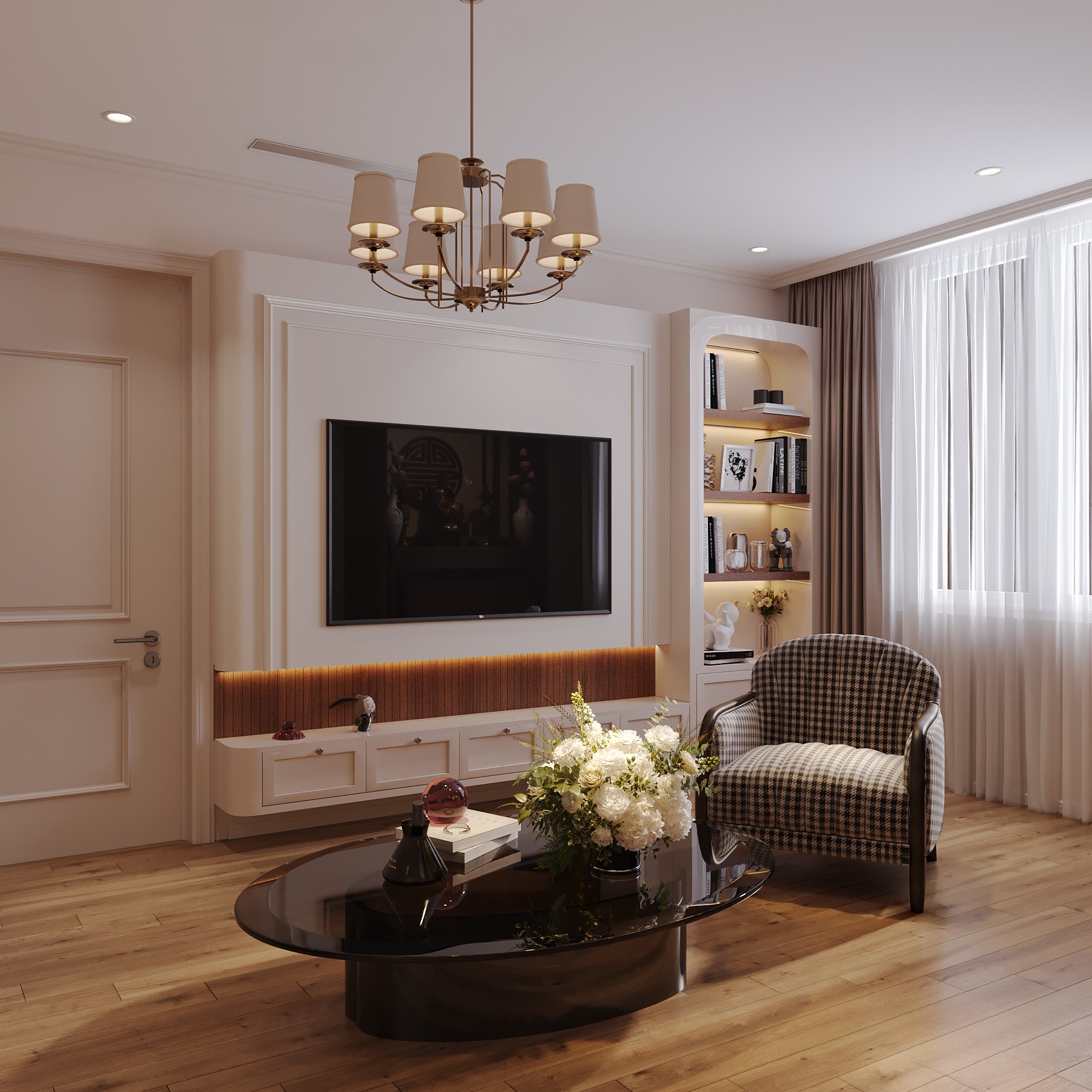 Với diện tích 86m², bài toán đặt ra là tối ưu không gian nhưng vẫn giữ được chất “cao cấp”. DRG lựa chọn phong cách tân cổ điển nhẹ, lược bỏ chi tiết cầu kỳ, tập trung vào: