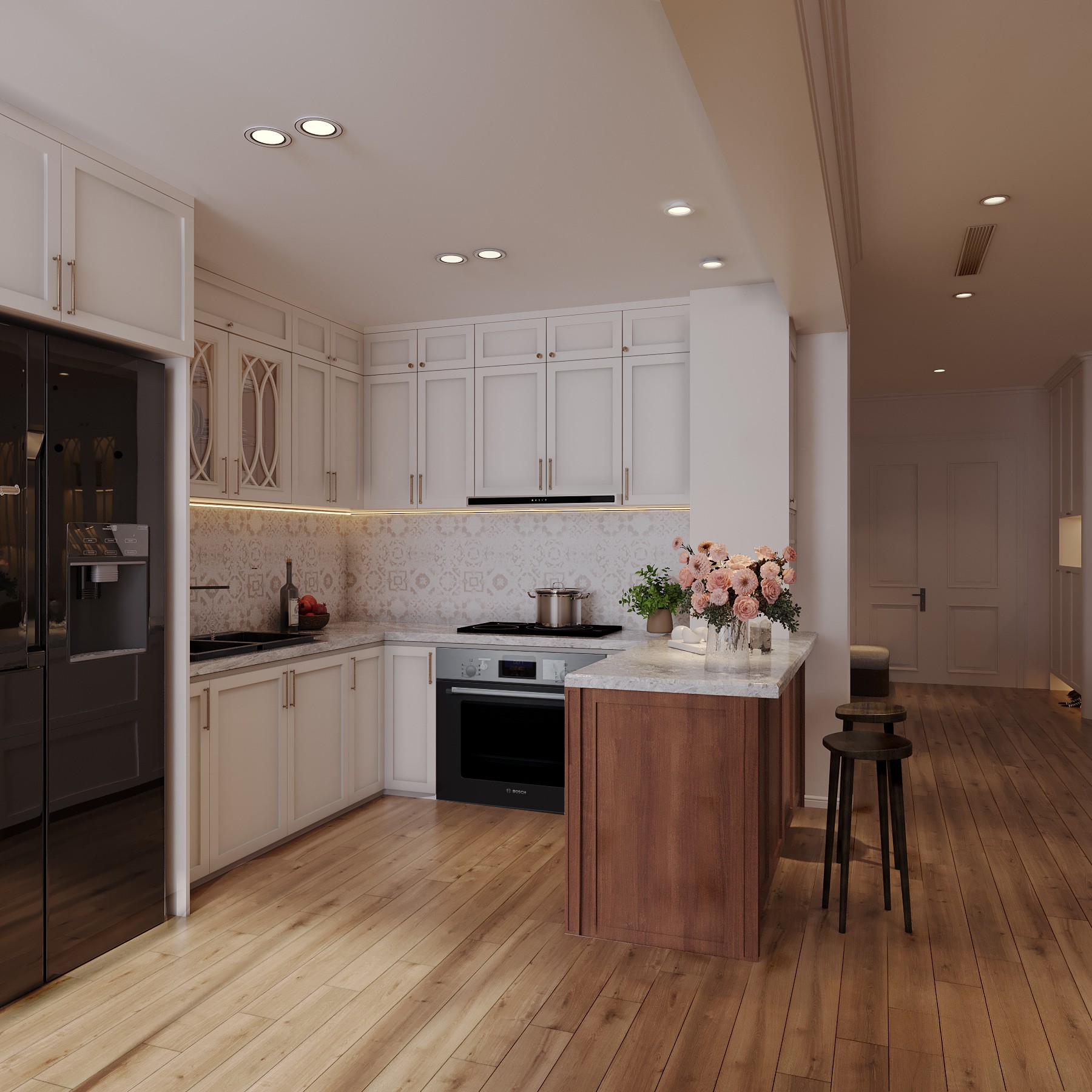 Khu bếp được thiết kế theo phong cách bếp chữ L kết hợp đảo bếp: